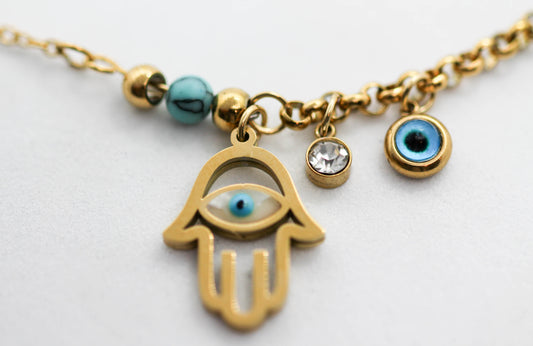 PULSERA MANO DE FATIMA MITAD DELGADA/ MITAD GRUESA ESFERA AZUL, CIRCONIA OJO COLGANDO,18CM + EXTENSION 4CM