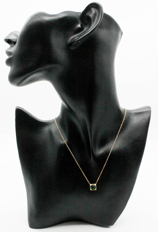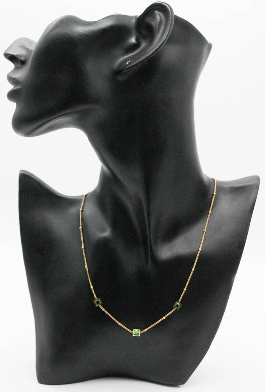 COLLAR SOLITARIO CUADRADO CIRCONIA VERDE ESMERALDA 8MM 43CM + EXTESION DE 5CM; TONO DORADO