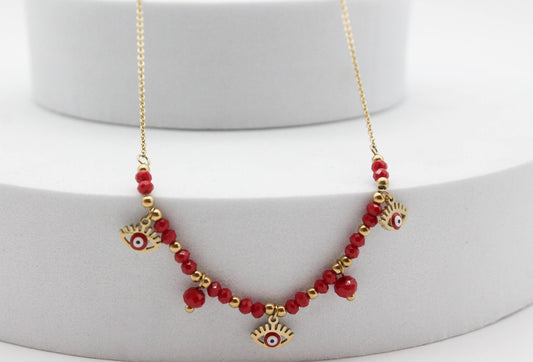 COLLAR 3 OJOS ROJOS PESTAÑAS 8MM, DOS CRISTALES 5MM COLGANDO 40CM + EXTENSION DE 5CM