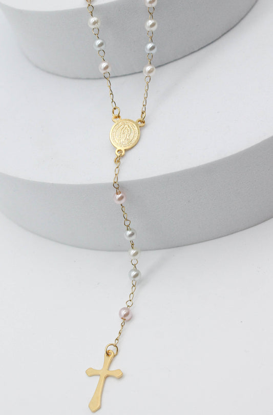 ROSARIO PERLAS SINTETICAS AZUL/BLANCA/ROSA 64CM DE LARGO VIRGEN DE GUADALUPE, CRUZ 20X12MM