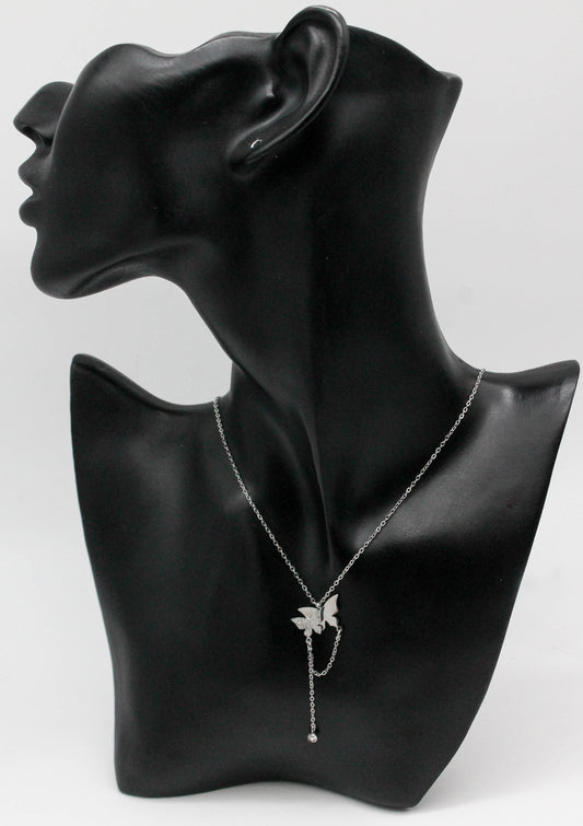 COLLAR MARIPOSA DOBLE 20MM, CADENA CIRCONIA COLGANDO, 40CM + EXTENSION 6CM; TONO PLATEADO