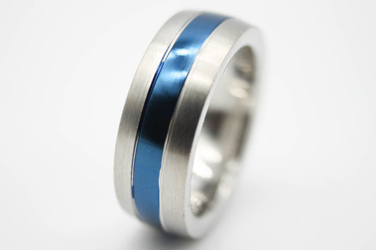 ANILLO CABALLERO NEGRO CON CANALES TIPO RODADURA; INTERIOR, FILOS Y DESTELLOS AZUL METÁLICO