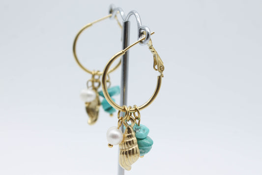 ARRACADAS DIJE CARACOLA, PERLA Y PIEDRAS AZUL, TONO DORADO
