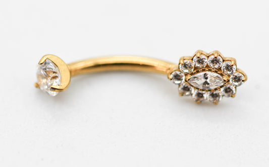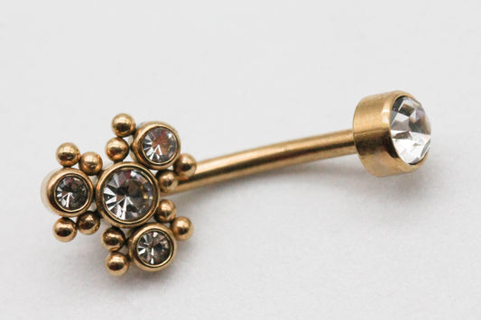 PIERCING OMBLIGO CIRCONIA MONTADA 4MM, FLOR ALARGADA CIRCONIAS; TONO DORADOPrecio habitual $ 338.00 MXNPrecio habitualPrecio unitario por-