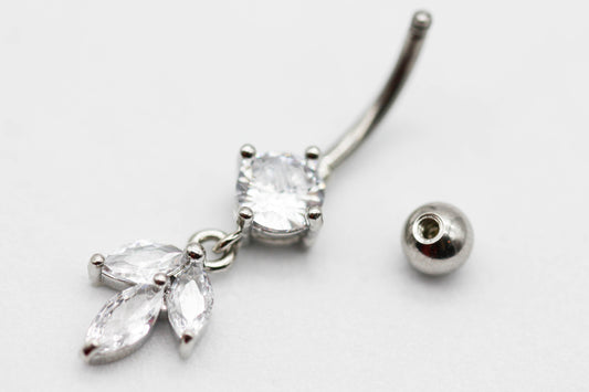 PIERCING OMBLIGO CIRCONIA MONTADA 7MM HOJA 3 CIRCONIAS 14X9MM ; TONO PLATEADOPrecio habitual $ 146.00 MXNPrecio habitualPrecio unitario por-