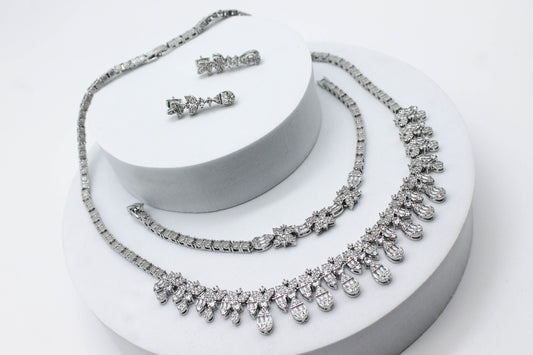 *SET HOJA / GOTA CRISTALES BLANCOS; ARETE 2.5CM DR LARGO; PULSERA 19CM; COLLAR 47CM; TONO PLATEADO*