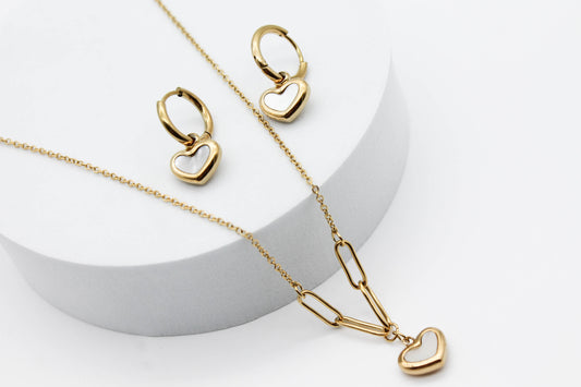 SET CORAZON HUGGIEES TUBULARES 12MM DIJE 10MM, CADENA BARBADA GRUESA Y DELGADA 45CM + EXTENSION 5CM; TONO DORADO
