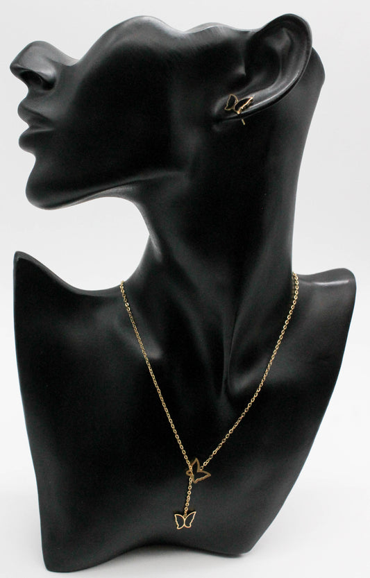SET MARIPOSA AZUCARADA BROQUEL 8MM COLLAR ESLABON PLANO MARIPOSA GRANDE 12MM/CHICA 9MM, 40CM + EXTENSION 6CM; TONO DORADO