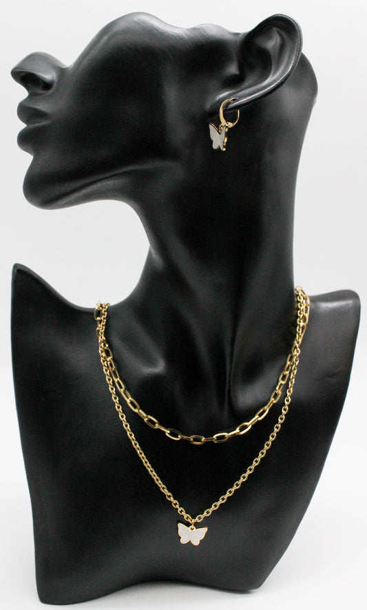 SET MARIPOSA MADRE PERLA DIJE 15MM; COLLAR DOBLE 47CM Y 40CM + 4.5 CMS EXTENSION; TONO DORADO