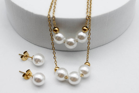 SET DOBLE PERLAS SINTETICAS BROQUEL 8MM; COLLAR ES 30 Y 40CM; TONO DORADO
