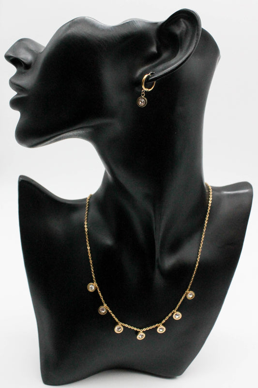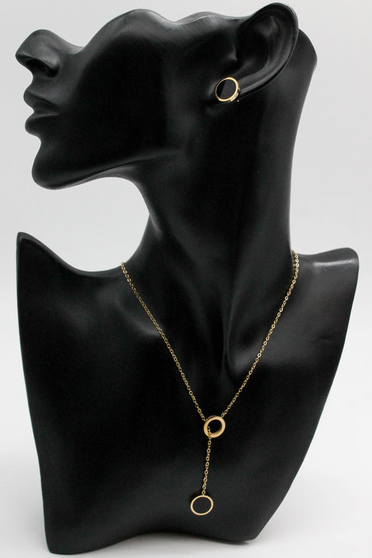 SET CIRCULO ONIX DIJE 12MM; COLLAR CORBATIN 42CM + 5CM EXTENSION; TONO DORADO