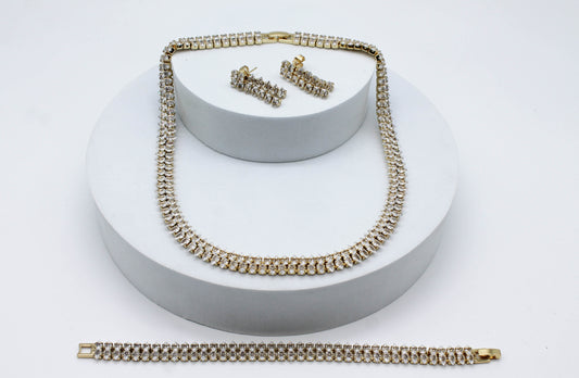 *SET DOS LINEAS CRISTALES EN GOTA; ARETE LARGO 3CM; PULSERA 18CM; COLLAR 40CM; TONO DORADO*