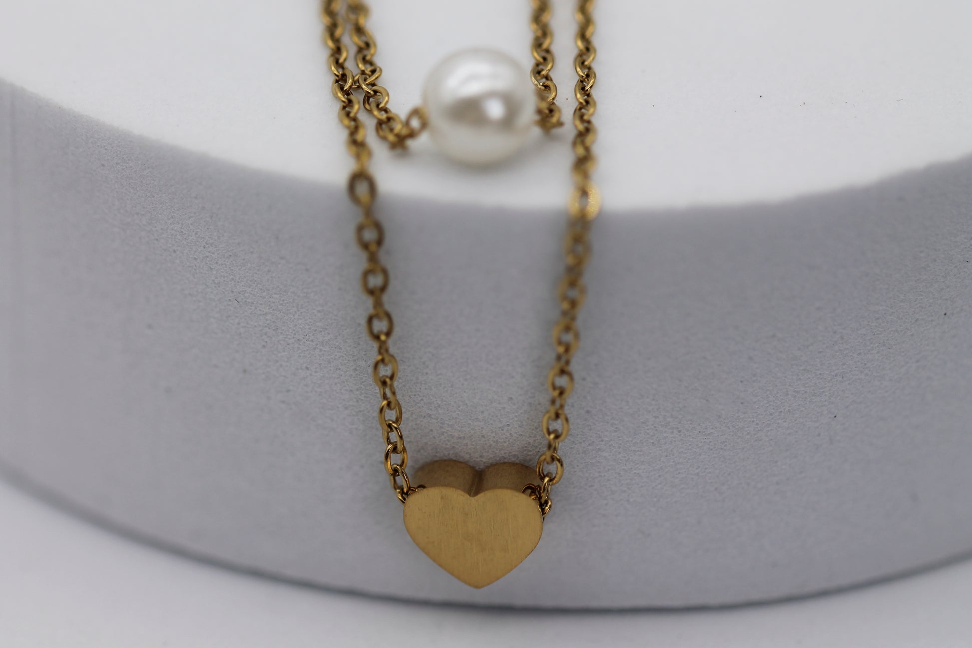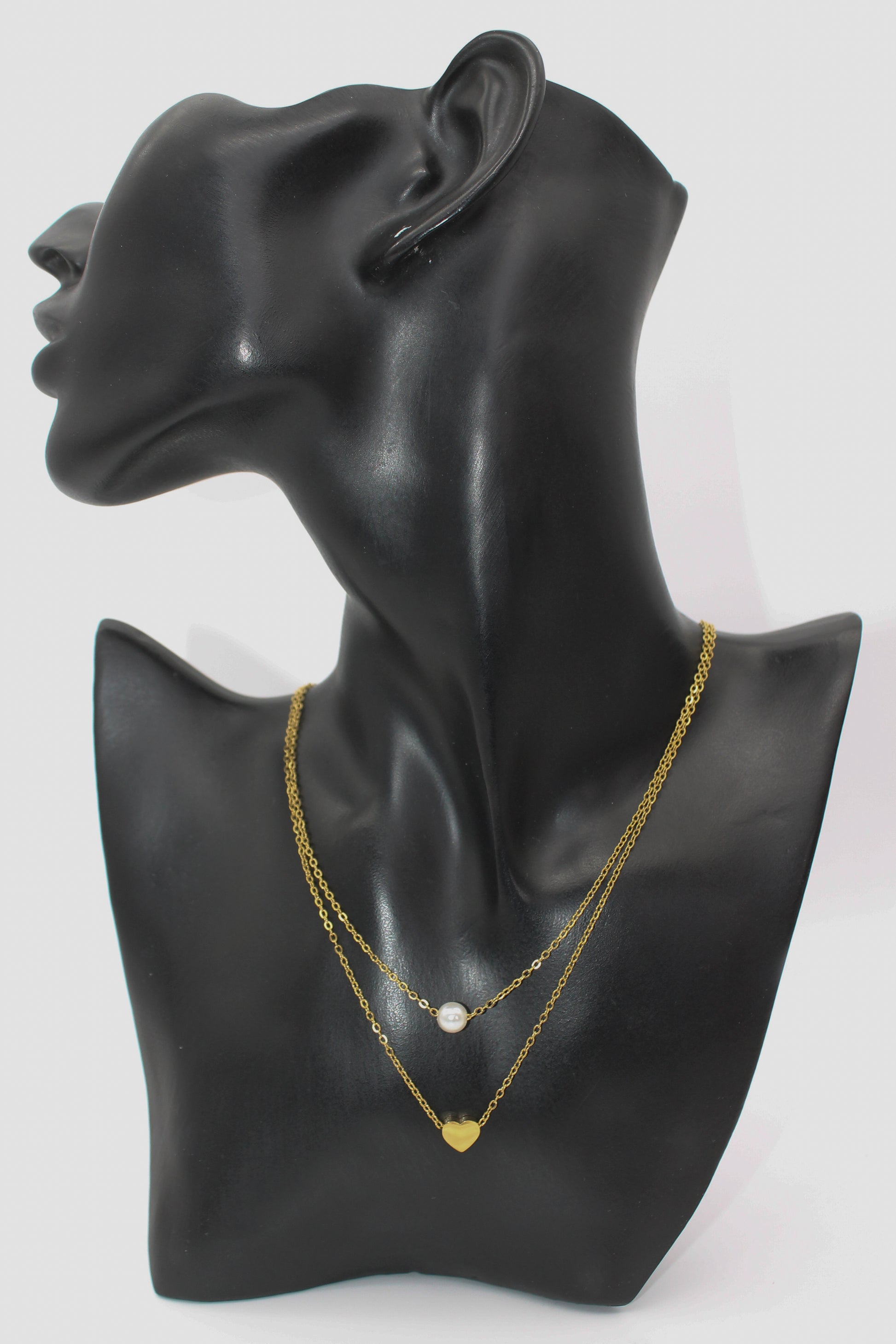 COLLAR DOBLE PERLA SINTETICA 40CM DE LARGO CORAZON 44CM - DIJES 7MM, TONO DORADO