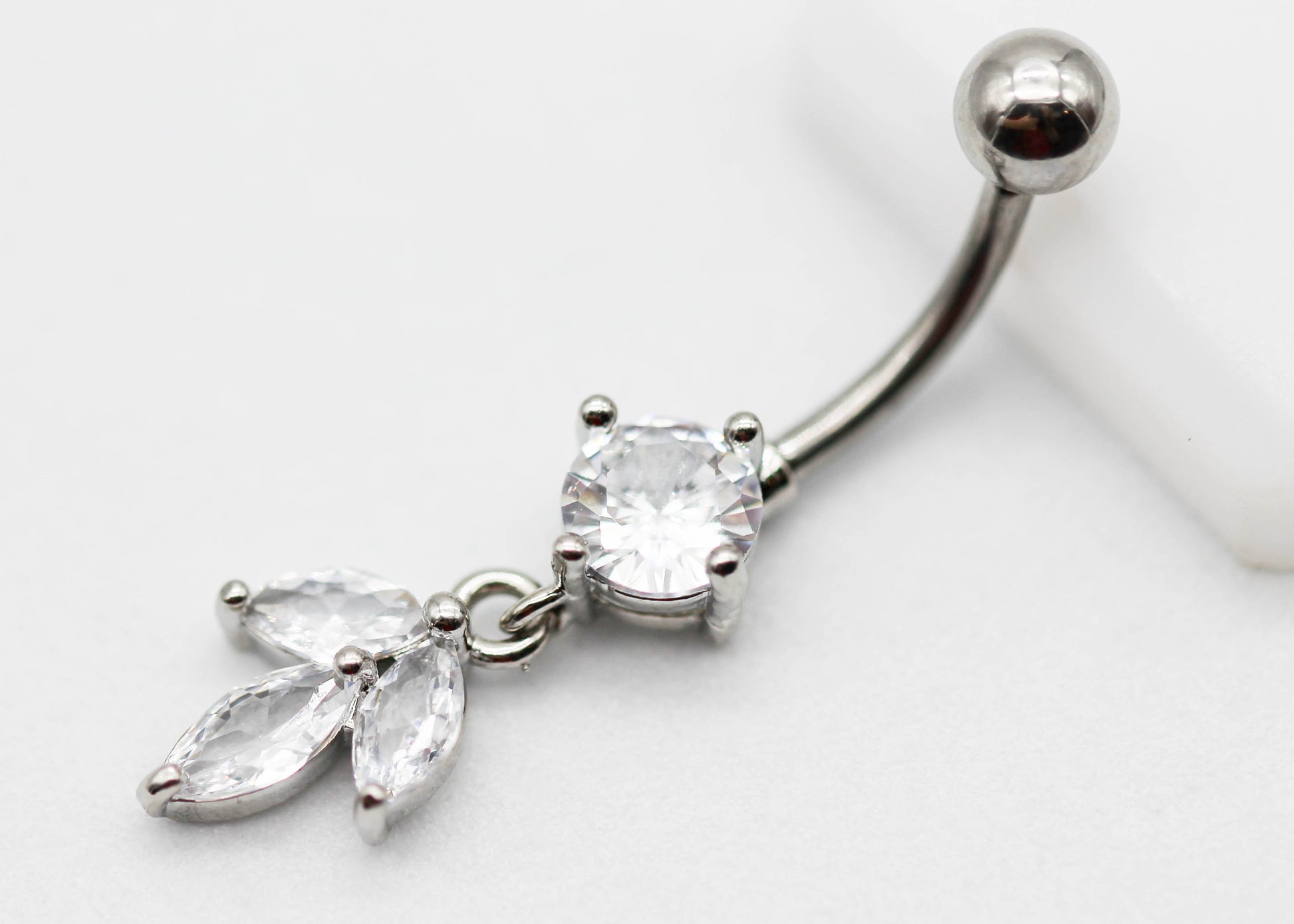 PIERCING OMBLIGO CIRCONIA MONTADA 7MM HOJA 3 CIRCONIAS 14X9MM ; TONO PLATEADO