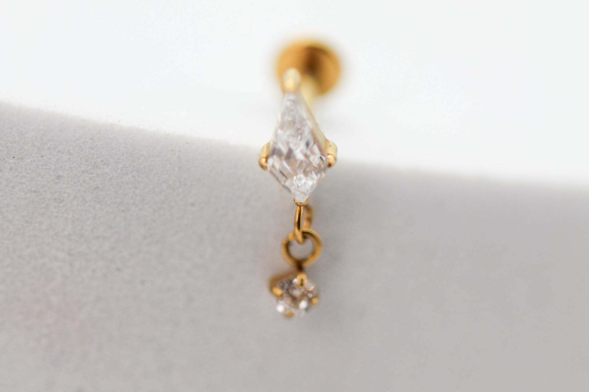 PIERCING ROMBO ALARGADO 7MM, MINI CIRCONIA 2MM COLGANDO; TONO DORADO