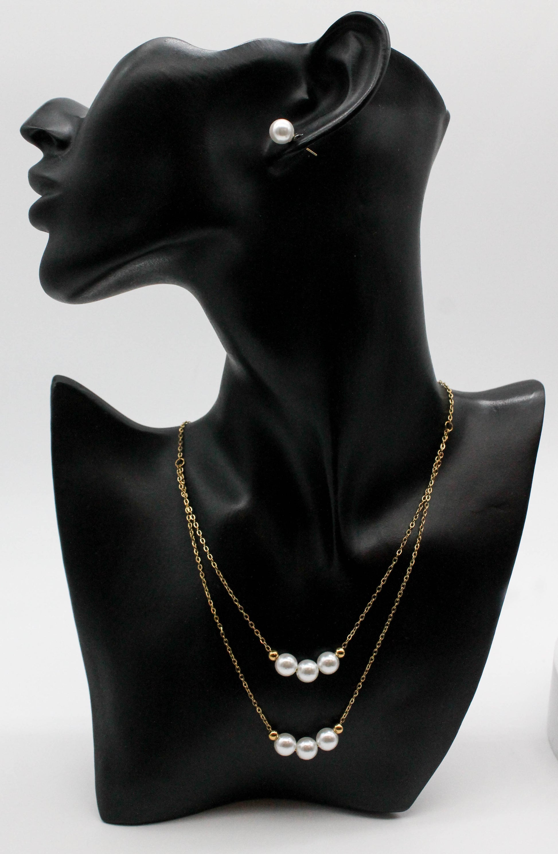 SET DOBLE PERLAS SINTETICAS BROQUEL 8MM; COLLAR ES 30 Y 40CM; TONO DORADO