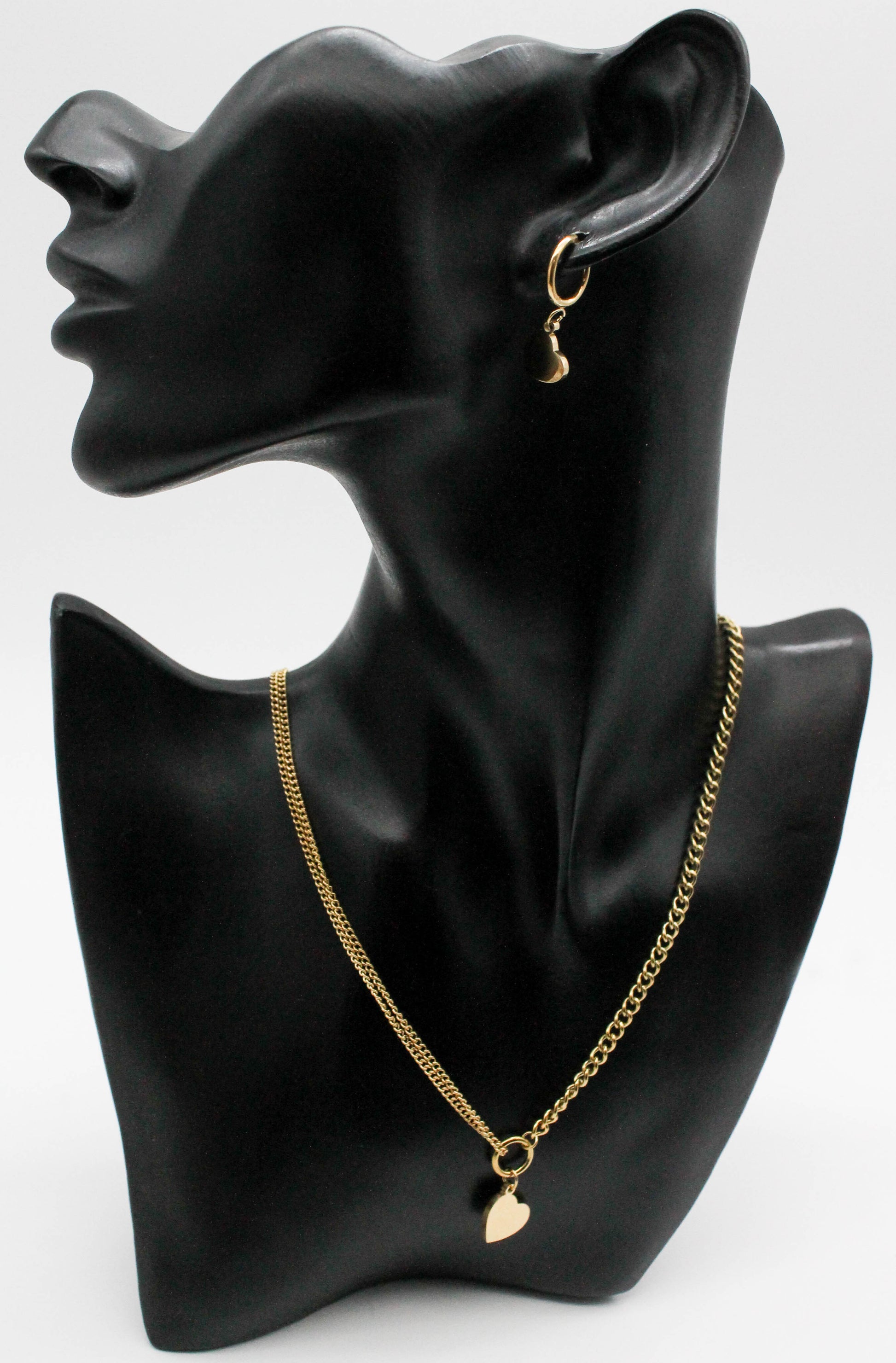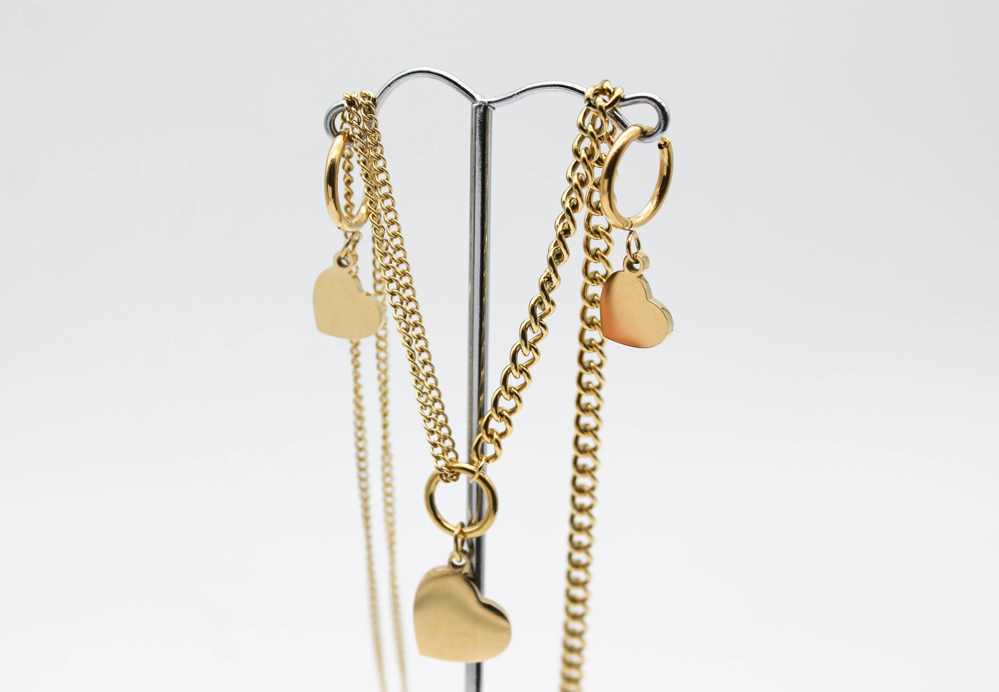 SET CORAZON HUGGIEES TUBULARES 12MM DIJE 10MM, CADENA BARBADA GRUESA Y DELGADA 45CM + EXTENSION 5CM; TONO DORADO